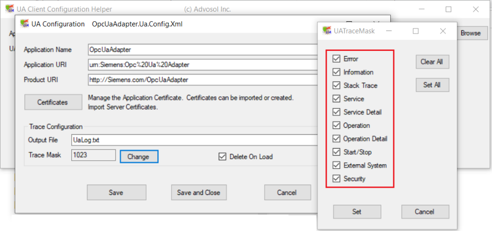 The OPC UA client trace log files are available in C:\Program Files (x86)\Siemens\SORIS OPC UA Adapter.