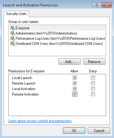 c. Click OK. - In the Launch and Activation Permissions section, click Edit Limits.