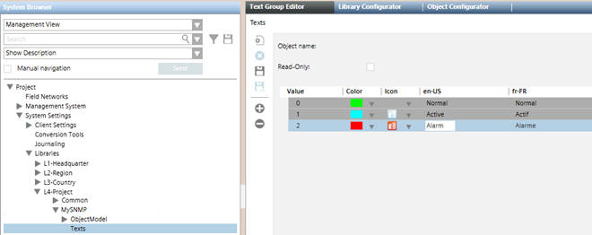 - In System Browser, select Project > System Settings > Libraries > [L4-Project] or [L3-Country] or [L2-Region] > Global > SNMP > Texts.