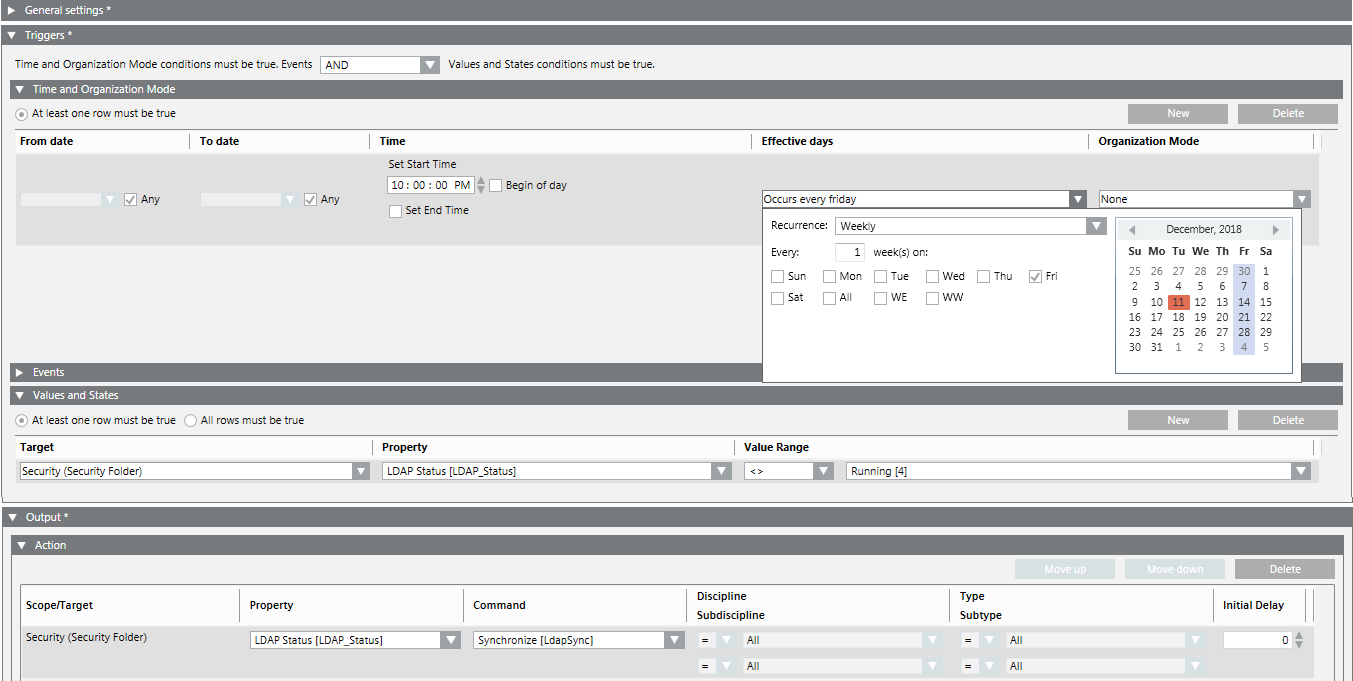 c. In the Effective Days column, open the drop-down list and, for example, set Recurrence: Weekly, select the frequency Every: 1 week, and select an option. - In the Output expander, open the Action expander.