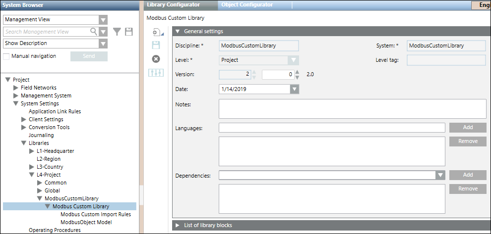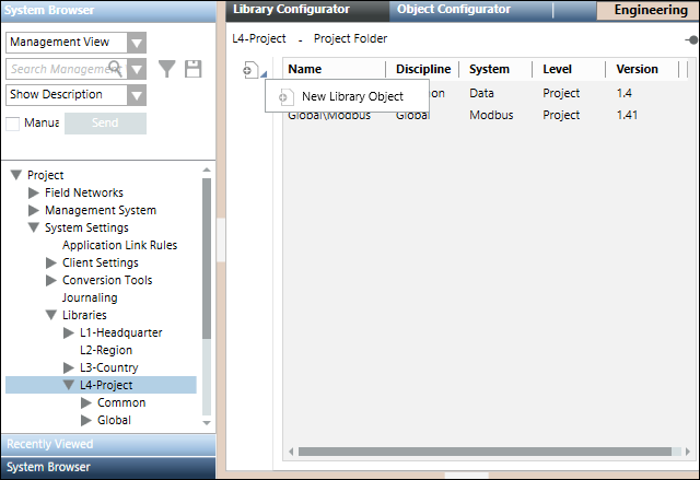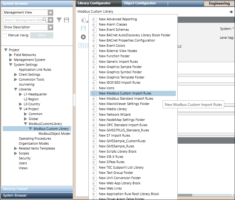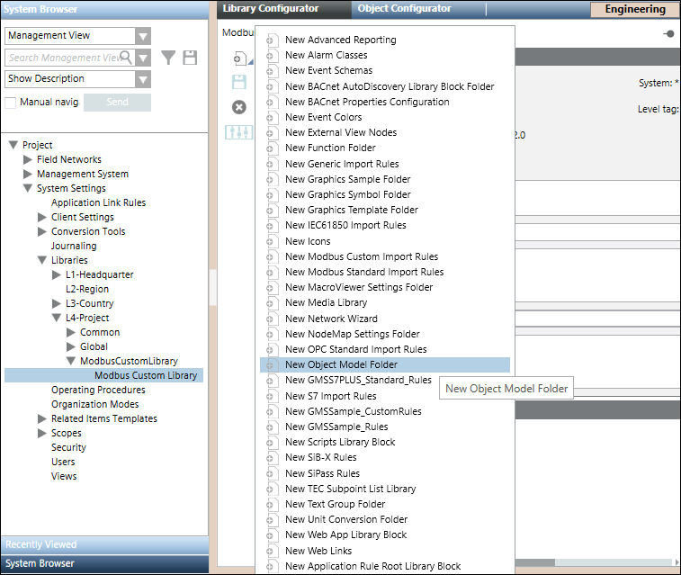 3. Create an object model folder in it by selecting New Object Model Folder menu option in the list that displays on clicking Add new object . Also, create an import rules folder by selecting the New Modbus Custom Import Rules menu option. For information, see Adding Blocks to a Library.