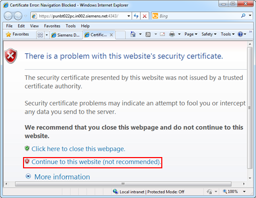 - In the Desigo CC web page address bar, a Certificate Error security report displays.