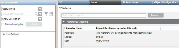 2. In the Siclimat Import tab, open the Hierarchies Mapping expander, and define the destination in the optional views (logical view and User View) of the data structures (hierarchies).