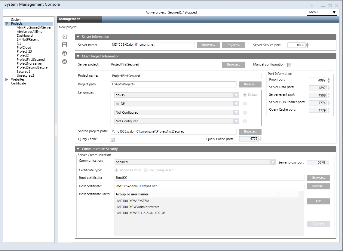 b. (Optional) Edit the project path. - In the Communication Security expander, add the project’s Pmon user to the list of user’s in Host certificate user, if the Pmon user is not an administrator user or already added in the list. Adding the user in the Host certificate user provides access to the user on the host certificate and its private key.