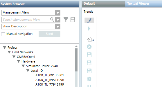 • Select the Manual navigation check box and thereafter, select the BACnet points. Drag the selected BACnet points to the Trend Viewer.