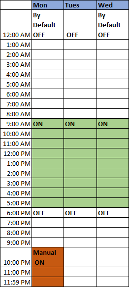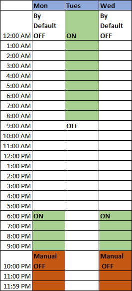 In this case, if you manually trigger the state of the point to ON at 10.00 p.m. on Monday, then the schedule shall remain ON till 11.59 p.m. on Monday.
