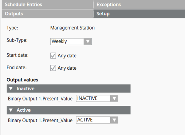 You create a weekly schedule from the Sub-Type drop-down list in the Setup tab. The last state of the day will be retained post-midnight until the next day schedule entry is triggered.