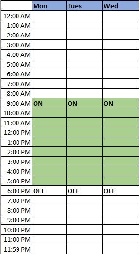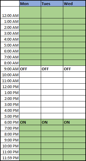 Time period for the schedule (Active : 12:00 a.m., Inactive : 9:00 a.m., Active : 6:00 p.m.)