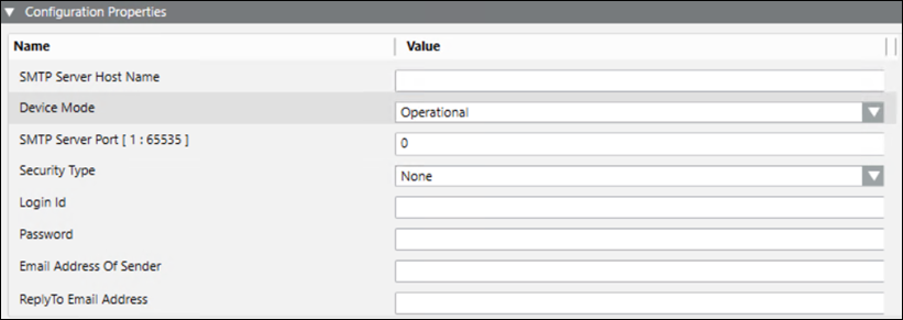 6. In the Configuration Properties expander, configure the parameters for SMTP Email Server as stated below (For more information refer to the SMTP Email Server section in Notification Supported HW/SW Device Configurations Guide):