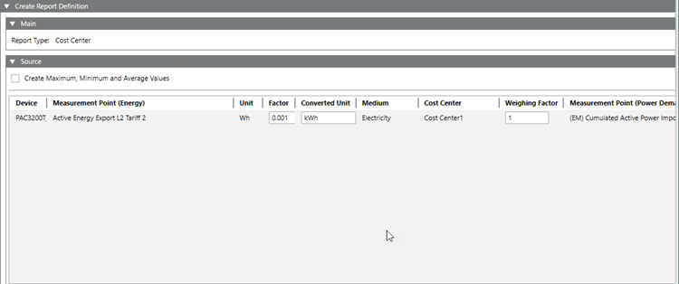 3. In the Source expander, the Create Maximum, Minimum and Average Values check box is unchecked by default. Select this check box to include the maximum minimum and average values in the report.