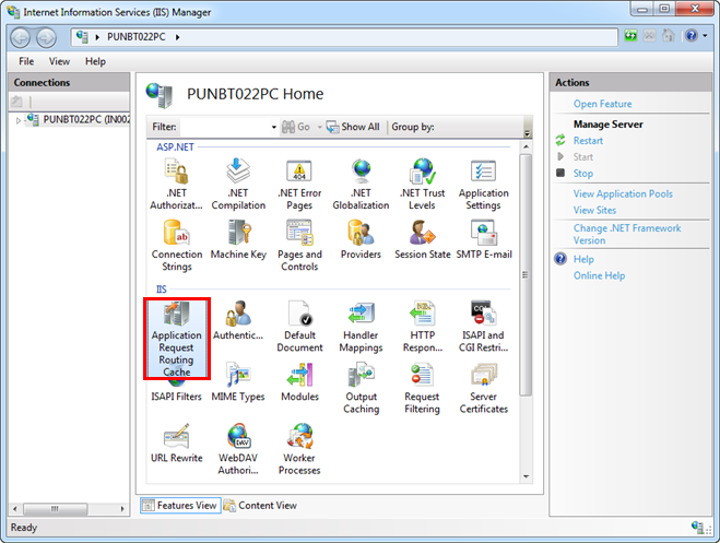 - In the IIS Manager window, verify if Application Request Routing Cache is present. Otherwise, re-run the Gms.InstallerSetup.exe file that installs the prerequisite ARR.
