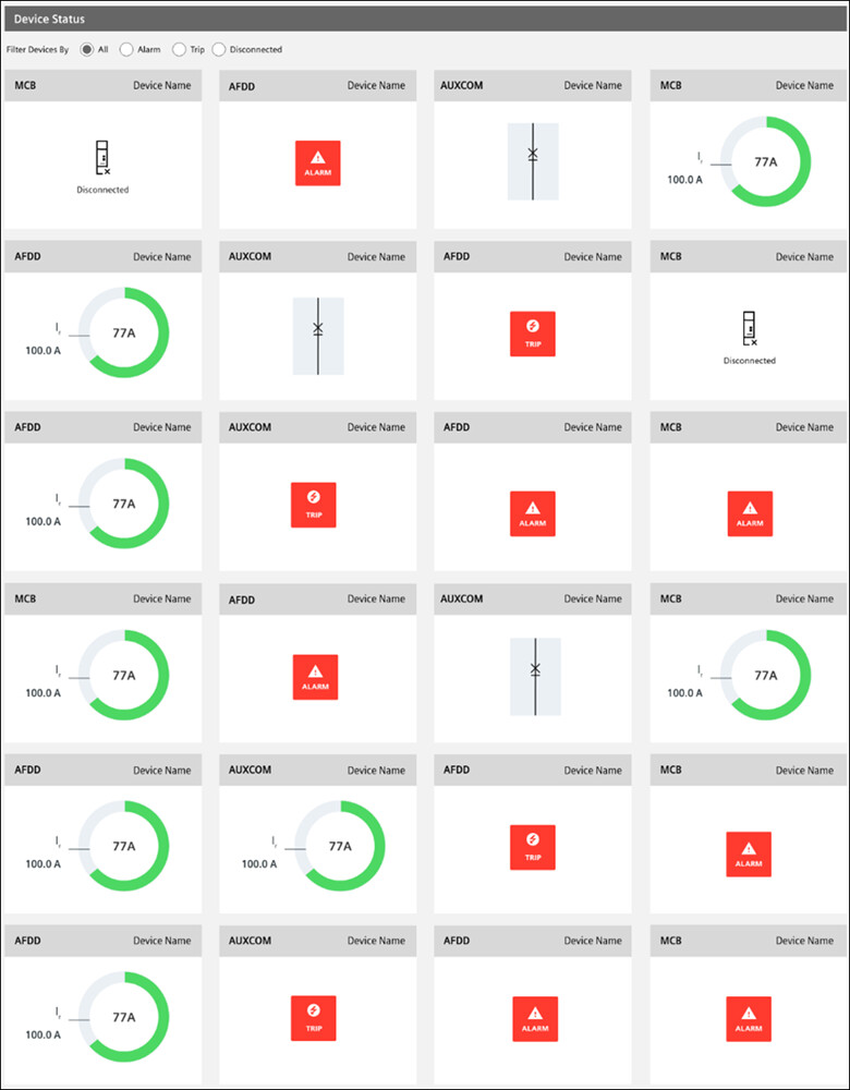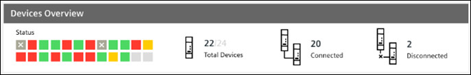 The Overview tab displays the summary of different data point values measured by the devices connected through the Powercenter 1000 transceiver. It contains the following sections: