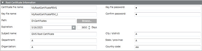 When you create a root certificate for the first time, all the fields appear blank. For all subsequent root certificate creation (.pfx or .pem based), some fields, such as Path, Organization, and so on, are pre-populated with the information from the last-created root certificate.