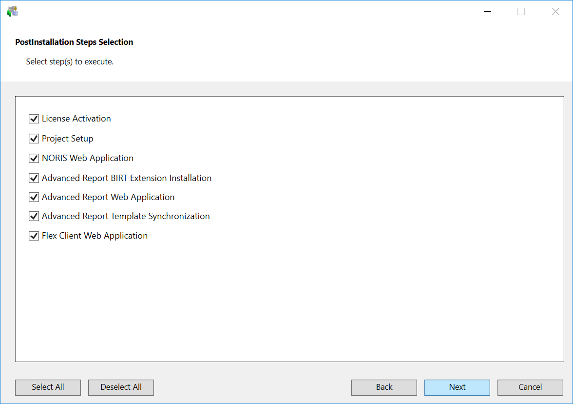 NOTE: Only those post-installation steps, for which the tag is configured as Execute = AskUser in the [GMS/EMName]PostInstallationConfig.txt file, are displayed in the PostInstallation Steps Selection dialog box. - Deselect the post-installation step that you do not want to execute.