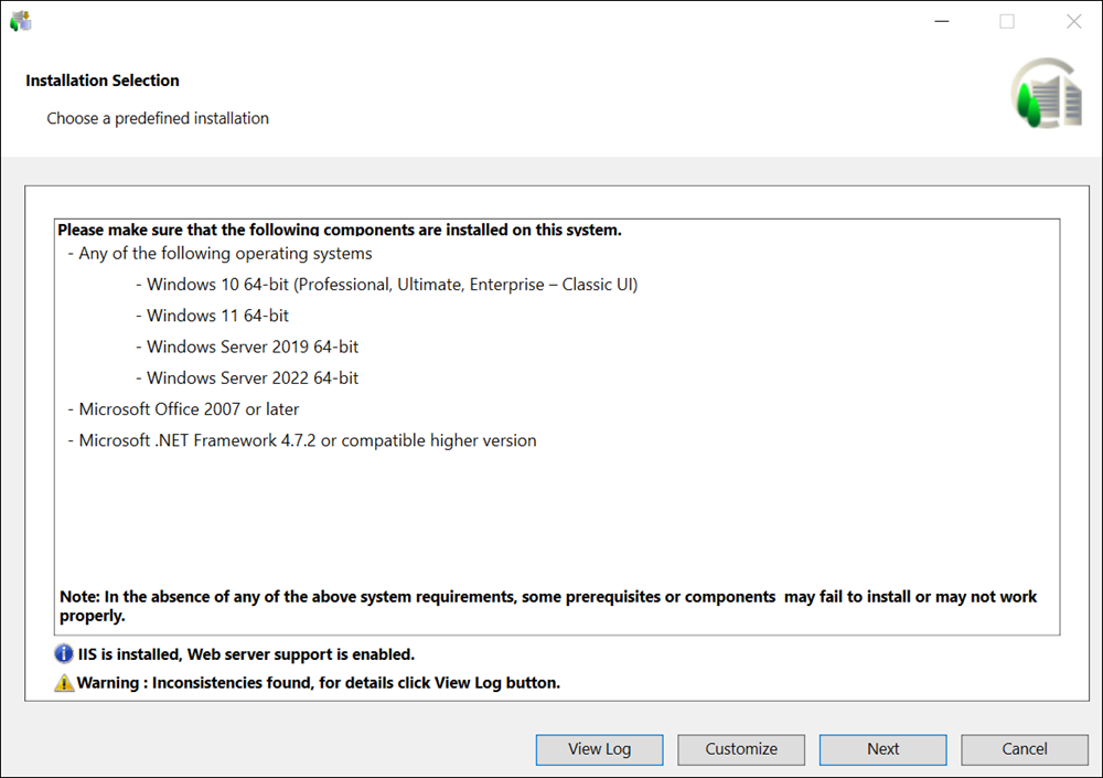 If all required IIS components are already correctly installed and configured, an info message displays and you can proceed with installation.