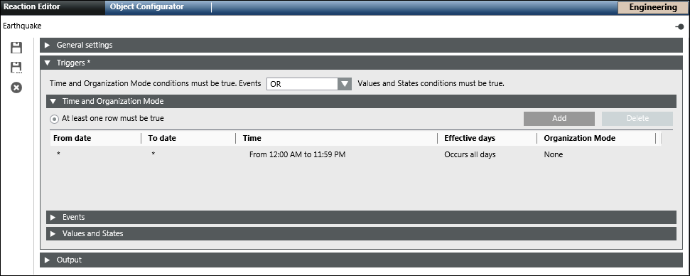 NOTE 2: For multi-select user variables, enter the variable values separated by a comma and a space after the comma. For example, List=0, 1, 2 - In the Triggers expander, specify if the conditions specified in both, Events as well as Values and States expanders, must be true or if the conditions specified in either of the expanders must be true by selecting the appropriate operator (AND, OR) in the drop-down list.