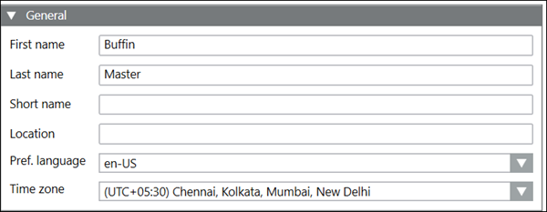 The General expander displays the general details of the recipient, for example, first name, last name, short name, pref. language and time zone drop-down.
