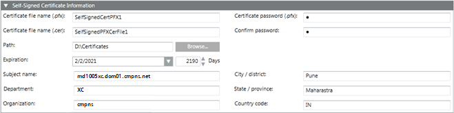 Certificate file name (.pfx) | Type the file name of the .pfx self-signed certificate. The certificate file name must not contain blanks or special characters (/,\,?,<, >,*,|,"). |