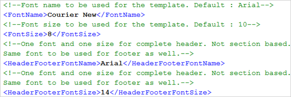 2. To set the font name and size for the header and footer: enter the font name and size within the <HeaderFooterFontName> and <HeaderFooterFontSize> tags.