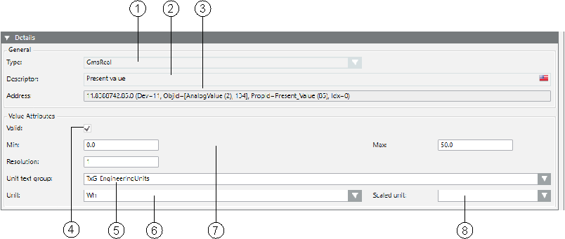 6 | Unit text group | List of available text groups. New or updated text groups must be refreshed by pressing the F5 key. For value-scaled units, the TxG_EngineeringUnits must be selected. |