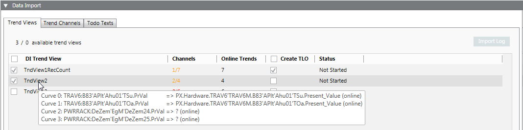 NOTE: Tooltip displays the assignments. - Select the Create TLO check box if you want to create an online trendlog object belonging to the Trend View.