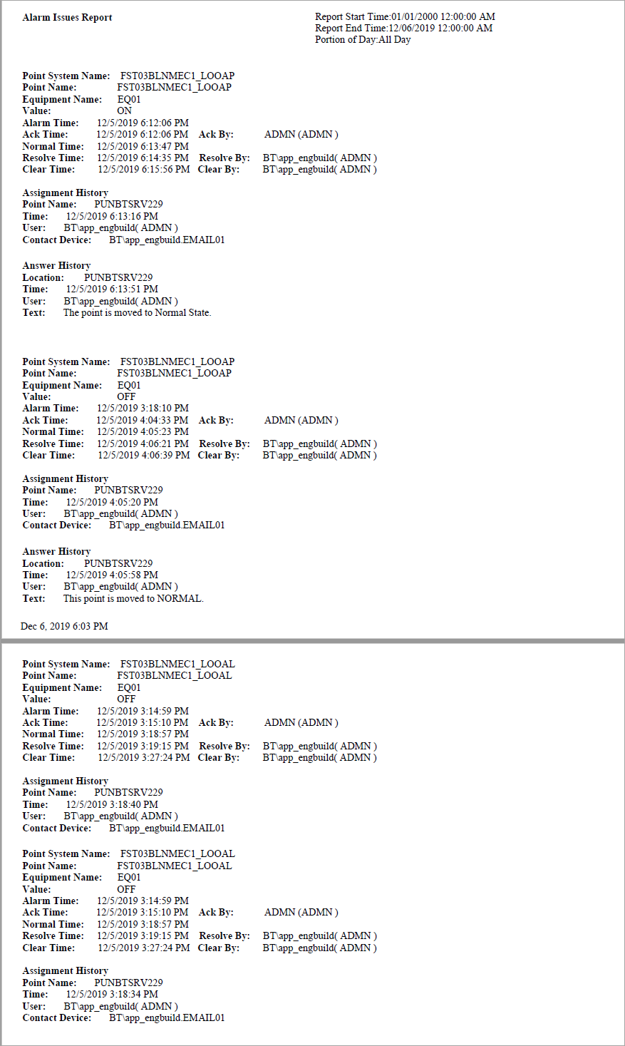 This report is designed to show the cycle of a point from when it goes into an alarm state, when it is acknowledged and cleared, and when it goes back to a normal state. The point’s alarm details and summaries are recorded in this report. The report also specifies which point were/are not in alarm during the time range.
