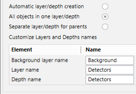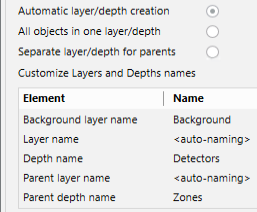 Select Automatic layer/depth creation to create a single depth including layers for each CAD object type and subtype. A second depth is created for parent objects that are not present in the CAD drawing, also separated in type/subtype layers. If parent and child objects are both present in the CAD drawing, they are imported in the first depth, and then the grandparent objects are added separately in the second depth. The table that appears below displays the resulting layers and depths Name, which you cannot customize. Note that layer names will be given from the object types/subtypes (<auto-naming>).