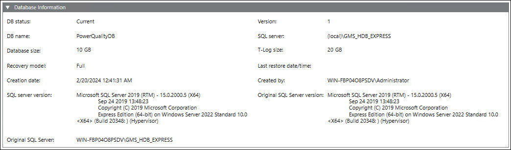Original SQL Server version | Displays the original version of the SQL Server used to create the PowerQuality Database. |