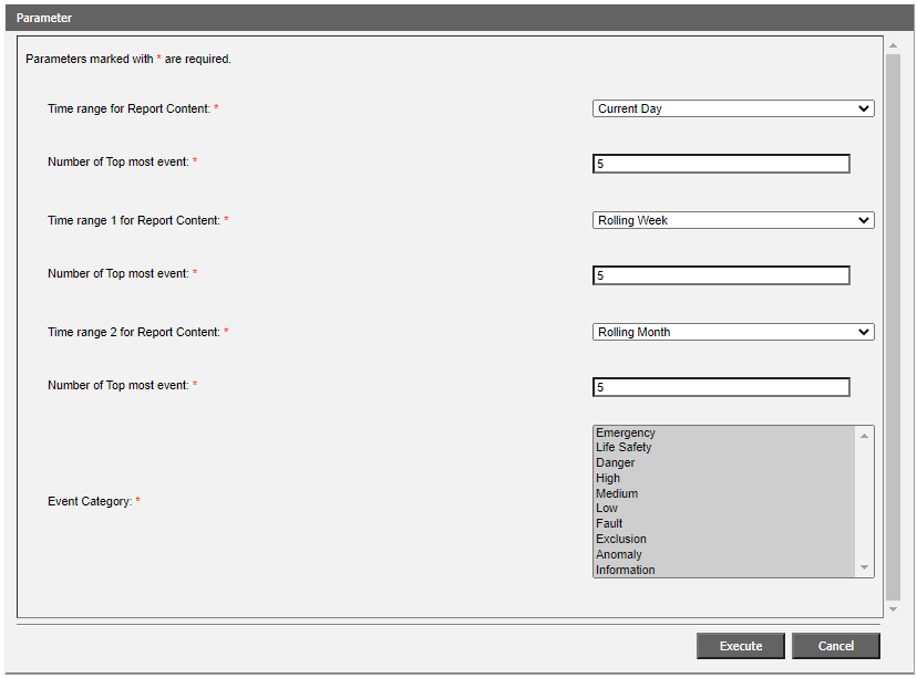 By default, it consists of three tables with five rows (one for each alarm source), the time intervals mentioned above, and filtered event categories. The standard report can be adjusted by: