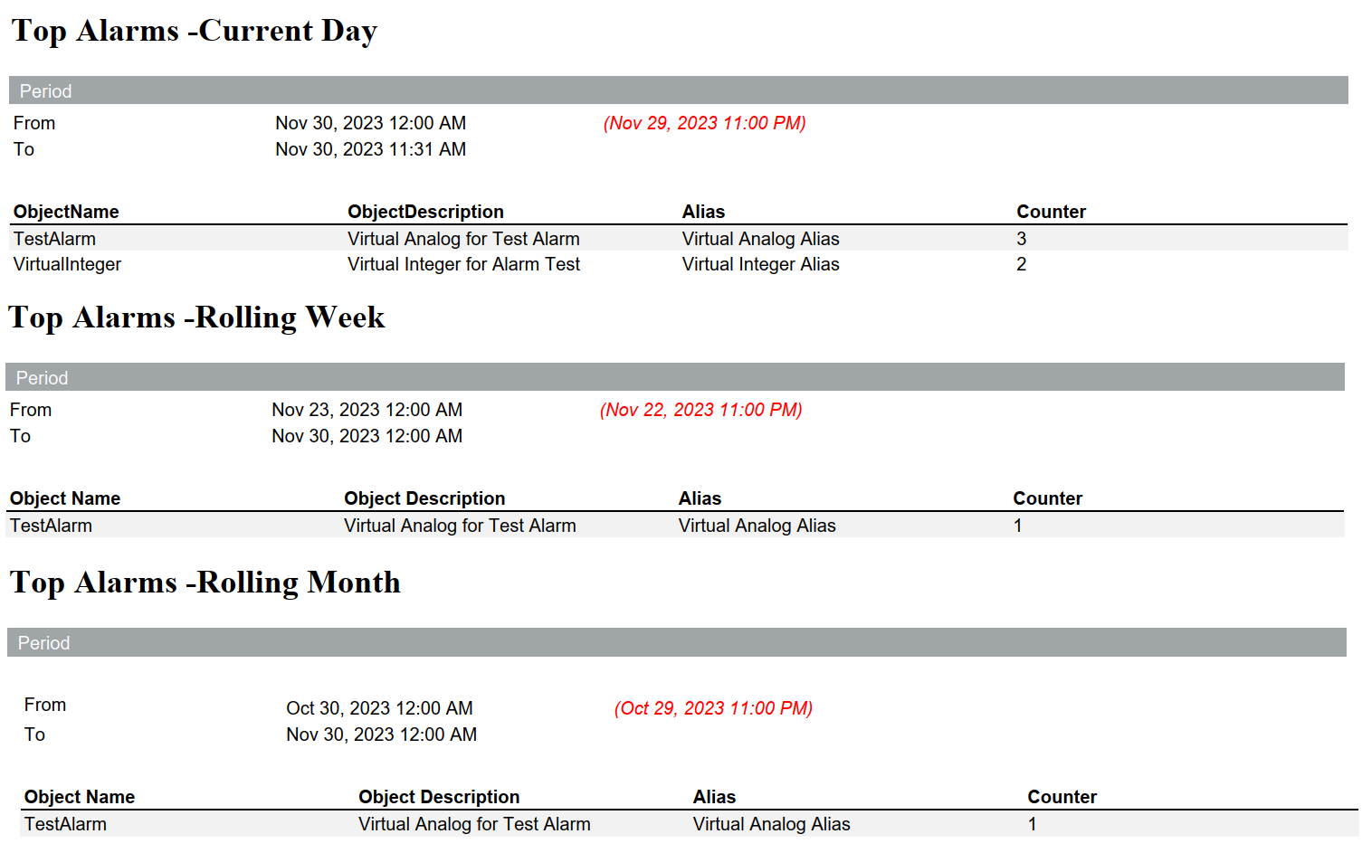 This report is designed to show the five most frequent alarms since midnight of the current day, rolling week, and rolling month.