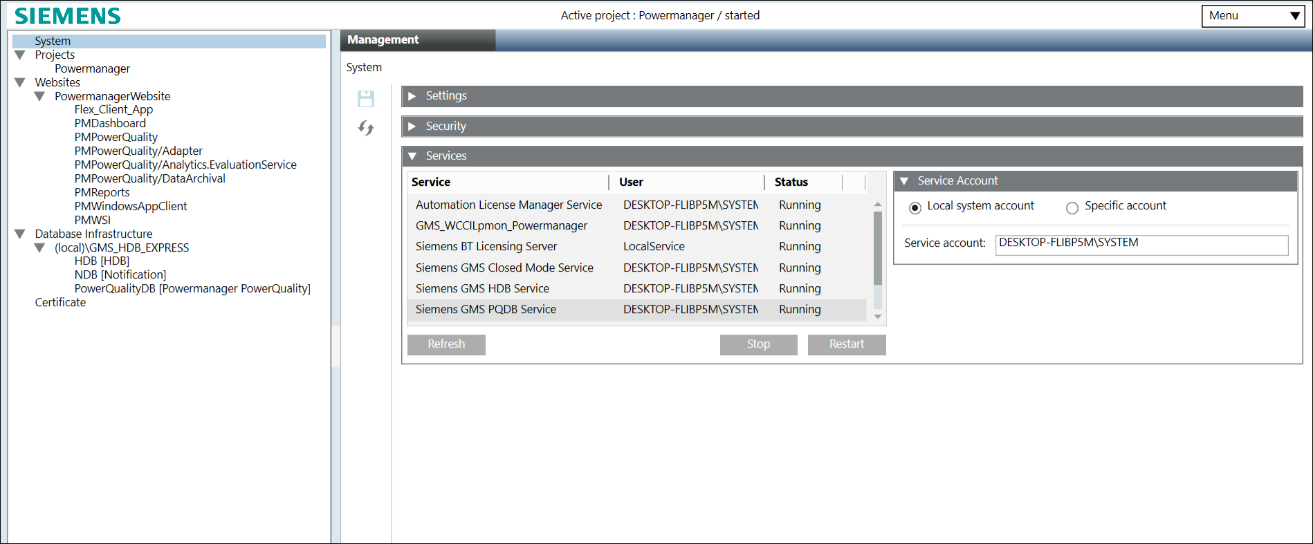 b. DB user: Desigo CC project user who requires PowerQuality Database user rights for read and write operations. You can change it as required in System Account Settings. See Settings Expander .