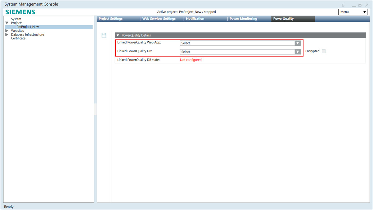 NOTE: To unlink the PowerQuality Web App or the PowerQuality Database from the project, remove the Linked PowerQuality Web App and the Linked PowerQuality DB field values. If both the values are not removed, then the web app and database cannot be unlinked from the project and displays an error message.