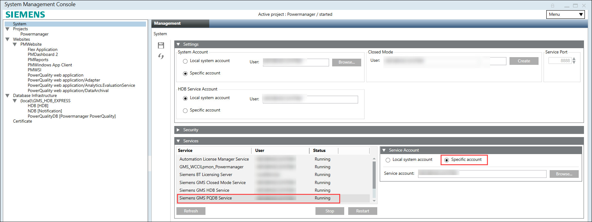 - Navigate to Services expander and select Siemens GMS PQDB Service.
