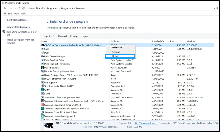 - Repair the OPC Core Components Redistributable (x64) 3.0.108.41 prerequisite. Select the prerequisite from the list of installed programs, right-click, and select Repair.